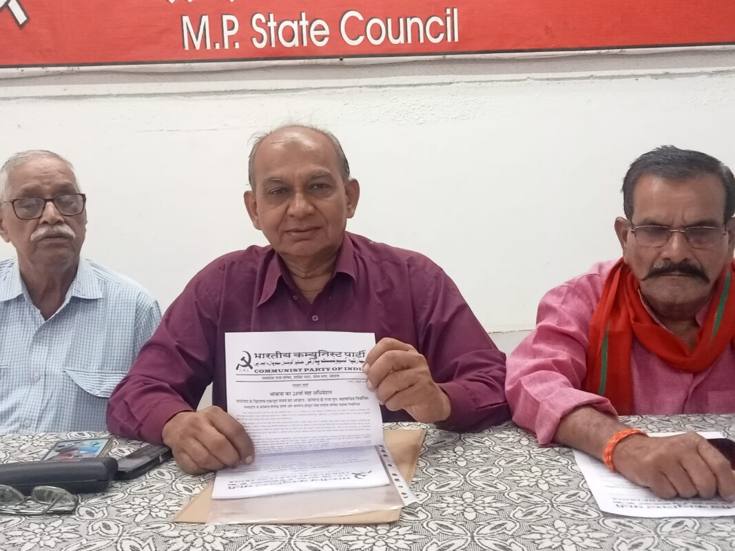 भारतीय कम्युनिस्ट पार्टी के मध्य प्रदेश राज्य सचिव कॉमरेड शैलेन्द्र शैली ने स्थानीय शाकिर सदन में आयोजित पत्रकार वार्ता में बताया कि चंडीगढ़ में आयोजित महा अधिवेशन में देश के 27 राज्यों से लगभग 800 प्रतिनिधि शामिल हुए ।इन प्रतिनिधियों का निर्वाचन भी विगत दिनों हुए विभिन्न प्रांतों के राज्य सम्मेलनों में किया गया था।इस हेतु एक हजार सदस्यों पर एक सदस्य के निर्वाचन का प्रावधान किया गया था।लेकिन केरल जैसे लाखों की भाकपा की सदस्यता वाले राज्यों के लिए अधिकतम 100 प्रतिनिधियों के निर्वाचन की सीमा निर्धारित की गई थी।मध्य प्रदेश से 4 प्रतिनिधि कॉमरेड अरविन्द श्रीवास्तव, कॉमरेड हरिद्वार सिंह ,कॉमरेड संजीव राजपूत और कॉमरेड शैलेन्द्र शैली भाकपा के महा अधिवेशन में शामिल हुए।