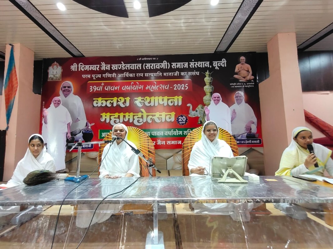 बूंदी.KrishnakantRathore/ @www.rubarunews.com>>चौगान जैन मंदिर में विराजमान प.पू. गणिनी आर्यिका 105 सत्यमति माताजी ने शुक्रवार को प्रातः की धर्म सभा में समवशरण का ज्ञान कराते हुए कहा कि चरित्रवान व्यक्ति तो धर्म की रक्षा करता है और जब धर्म की रक्षा नहीं कर पाता तो वह समाधि ग्रहण कर लेता है जैसे आ. श्री शांति-सागरजी म. ने की थी। इन्होंने कहा कि व्यक्ति को अपने जीवन में धर्म को प्रथम स्थान देना चाहिए, ताकि उसका उत्थान हो और अन्यथा धर्म को छोड़ने पर उसका पतन ही होता है और नरक जैसे धनधोर दुःखो को भोगता है।
