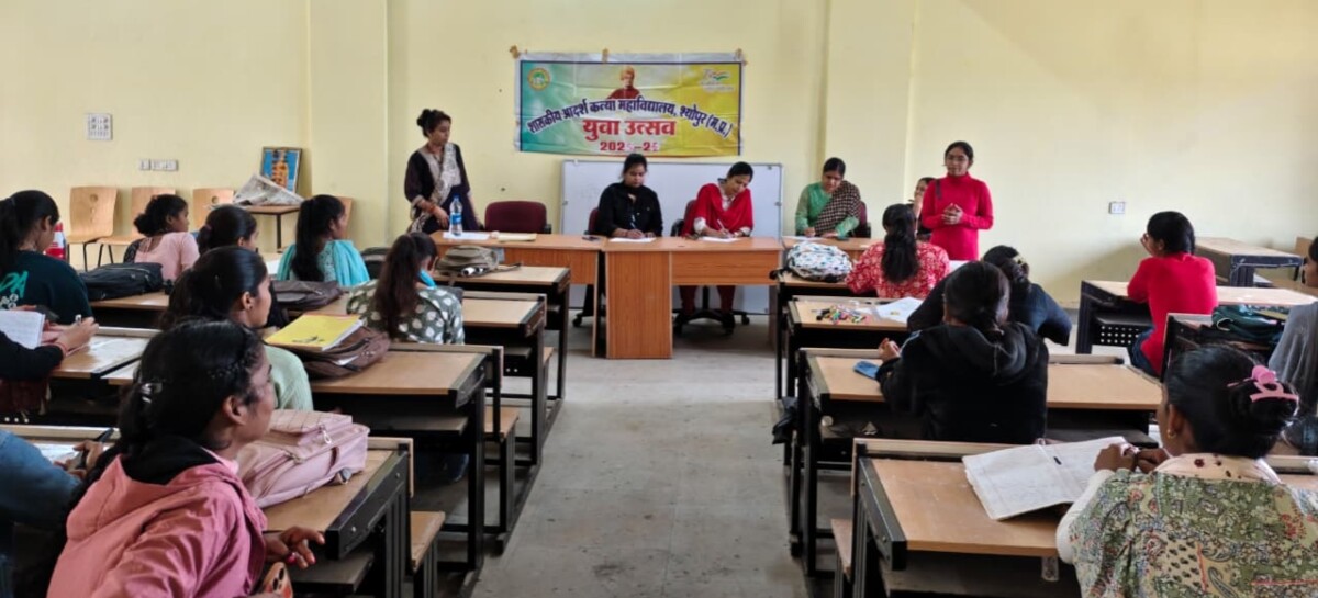 श्योपुर.Desk/ @ www.rubarunews.com- शासकीय आदर्श कन्या महाविद्यालय श्योपुर के प्राचार्य डॉ एसडी राठौर के निर्देशन में महाविद्यालय में आज युवा उत्सव कार्यक्रम का आयोजन किया गया। कार्यक्रम में सर्वप्रथम मां सरस्वती की प्रतिमा पर पुष्प अर्पित कर छात्रा बृजलता नागर द्वारा सरस्वती वंदना प्रस्तुत की गई।