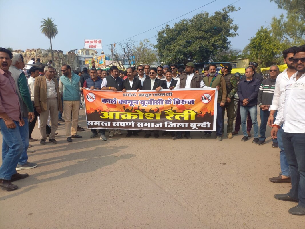 बूंदी.KrishnakantRathore/ @www.rubarunews.com-यूजीसी काले कानून के विरोध में सवर्ण समाज के लोगों में आक्रोश बढ़ता ही जा रहा है। सवर्ण समाज ने आज शहर में यूजीसी के विरोध में आक्रोश रैली निकाल जिला कलेक्टर को ज्ञापन सौंपा। रैली आजाद पार्क से शुरू हुई जो शहर के मुख्य बाजारों से होते हुए जिला कलेक्ट्रेट पहुंची, जिला कलेक्ट्री के अंदर जब लोगों को प्रवेश नही दिया गया तो रैली में मौजूद लोगों ने रास्ता जाम करते हुए अपना विरोध जताया। एक प्रतिनिधि मंडल ने राष्ट्रपति के नाम का ज्ञापन कलेक्टर को सौंपा।ज्ञापन में लिखा है कि यूजीसी द्वारा हाल ही में इक्विटी एक्ट 2026 रेगुलेशन लागू किया है जो 2012 के पुराने रेगुलेशनस की जगह लेता है। इस रेगुलेशन में दावा किया जा रहा है कि यह जब शिक्षा में समानता लाएगा और धर्म, जाति, लिंग जन्म स्थान, दिव्यागता आदि के आधार पर होने वाले भेदभाव को रोकेगा। हर संस्थान में एक इक्यात औषध्येनिटी सेंटर बनाया जाएगा जो भेदभाव की शिकायतों को संभालेगा और कमजोर वर्ग का सपोर्ट करेगा।
