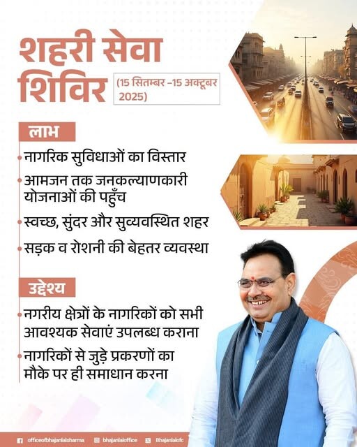 बूंदी.KrishnakantRathore/ @www.rubarunews.com>>राज्य सरकार के निर्देशानुसार नगरीय निकायों में 17 सितंबर से 17 अक्टूबर तक ‘ शहरी सेवा शिविर-2025’ का आयोजन किया जाएगा। अभियान के तहत वार्ड स्तर पर शिविर लगाकर आमजन की समस्याओं का मौके पर ही निस्तारण किया जाएगा और विभिन्न सरकारी योजनाओं के लिए आवेदन लिए जाएंगे।